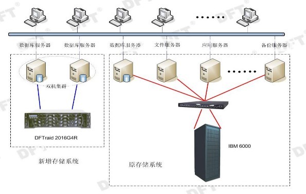 新增服务器安装IBM AIX小机系统,两台服务器通过双机软件搭建成双机热备系统,通过在两台服务器中安装SCSI HBA卡,通过SCSI线直接与DFTraid 2016G4R直接相连形成DAS的存储架构,DFTraid 2016G4R满配16块1TB SATA硬盘,其中8块盘配置成RAID5+Spare用于新增服务器双机系统的数据库数据存储,另外8块盘配置成RAID5+Spare用于LAN网络中文件服务器的数据存储。