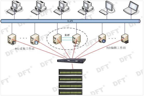 根据需求共9台采集工作站,两台MDC服务器,5台编辑工作站,在线存储容量为17TB。为满足客户高带宽、高可靠性和高性能的要求,我们采用DFT GS 3992T这款高性能的4Gb产品,为用户提供16Gb的系统带宽。通过SANergy共享系统软件,为所有的工作站提供大容量的存储空间,并保证了持续的高速数据读写传输。
