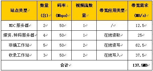 由上表,可以计算出整个系统需要的存储带宽,在设计存储设备时,要充分考虑计算出的带宽,最好留有20%的冗余。为以后扩容上留有充足的余量,可有效的避免在系统的扩充以后造成投资浪费。