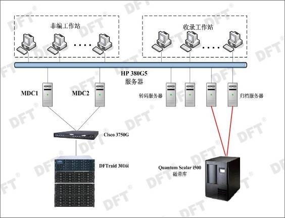 针对南方传媒集团的项目需求和带宽分析,结合DFT多年来的广电行业存储解决方案经验,建议用户使用在线磁盘阵列采用高性价比的DFT RS-3016I一套(含3个SBOD扩展柜),并配置60块500GB SATAII磁盘,另配置思科3750G千兆以太网交换机构建独立的IP-SAN网络,昆腾i500带库直连归档服务器做媒资归档。项目拓扑图如下: