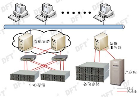 在方案的存储方面,用两台DFT ES-1600-X24-D的磁盘阵列做中心存储,采用了RAID5+SPARE的架构,总容量为7TB,且两台DFT ES-1600-X24-D磁盘阵列都采用Active/Active的工作模式,在这种工作模式下,其中任何一个控制器出现了故障另一个控制器会自动接管故障控制器的RAID,访问速度由原来的1Gb/s提升到4Gb/s,以保证PACS系统的读写速度。再用一台DFT ES-1600-SATA-D加一台扩展柜做PACS系统的备份,同样采用了RAID5+SPARE的架构,总容量为14TB,并且当中心存储出现了严重故障或维护时,用户可以通过手动更改IP的方式,让备份服务器代替中心存储以保证PACS系统的不中断工作。