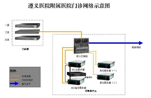 遵义医院附属医院是一所综合性中心医院,其服务网络系统是以医疗、教学、科研、预防、保健及管理为目的,为实现现代化医疗、计算机资源共享和信息交流提供良好的网络环境,为接入国内和国际互联网提供必要的条件。医院的网络系统是以成熟、先进、适用、高效、规范、安全、保密的网络建设为目标,同时兼顾未来的发展扩充和升级。