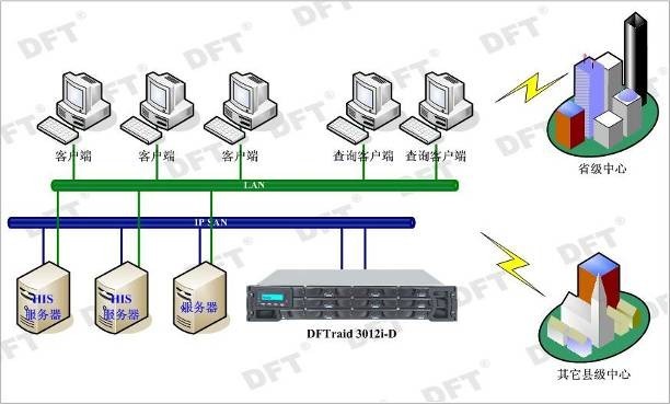 安徽省新农合项目采用分布式的解决方案,每个县级地方都配置了一台DFTraid 3012I磁盘阵列,使县级的点在读写数据时得到快速的响应,有效加快县级医疗点的工作效率。同时标准的iSCSI存储设备组成的IP SAN解决方案,方便了全省、全国医疗数据的同步建设。