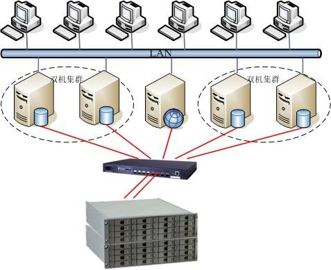 5)目前服务器为5台,今后还要扩展。其中共2台IBM255服务器做集群运行多媒体资源教学。一台IBM255运行OA办公应用,2台SUN E450数据库双机应用。数据存储容量设计要求达到4TB。