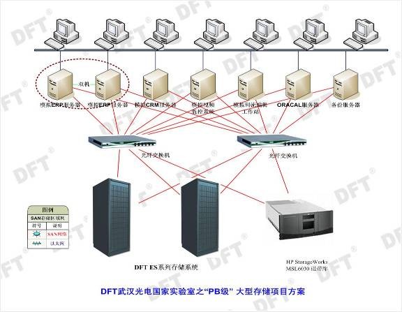 光电信息存储研究部经过对多家集成商的产品、技术和设计方案进行详细的论证和测试,最终选择了深圳市迪菲特科技股份有限公司提供的产品和方案。该方案提供了FC-FC高端磁盘阵列DFT ES1600-FFx2一台、FC-SATA高端磁盘阵列DFT ES 1600F-SATA八台、Infiniband 24口10Gb高速交换机一台、HP MSL6030磁带库一台、以及相关的SAN存储连接件和总容量超过1000000GB(约1PB)的各类磁盘。整个方案以SAN为构架,关键应用主机到磁盘阵列及扩展箱全部采用端到端的双链路冗余连接,FC-FC盘阵和Infiniband交换机作为高性能存储的性能极限测试,8台FC-SATA由于具备极佳的配置灵活性,可以组合成多种类型的存储体系而满足不同类型的应用需求,特别适合开展是网络和流媒体应用研究。HP MSL6030磁带库用于研究数据和实验环境的备份恢复,大量的SAN存储连接件和各类磁盘为实验室同时开展多项研究测试提供了极大的便利。