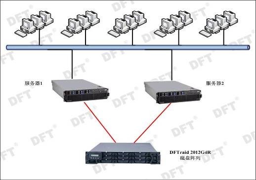 宜春学院电教中心目前的主要应用是向电教中心的客户机提供网络以及VOD视频点播服务。所以我们采用两台服务器通过DAS方式连接一台高性能DFTraid 2012G4R磁盘阵列(设计容量为4TB),来满足应用需求。