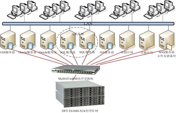 方案主要完成信息中心SAN网存储系统及NAS文件共享存储系统 ,同时完成数据库服务器高可用集群系统。为了解决用户以前数据分散,不易管理的问题,满足用户集中管理,集中存储的需求,信息中心所有的SQL,ORACLE,OA等应用服务器的数据存储将采用SAN存储架构,磁盘阵列采用DFT ES1600-X24全光纤磁盘阵列,DFT ES1600-X24拥有四个连接主机的光纤通道环路和超常的读写性能,具有670 MB/sec连续传输速度,支持高达72TB容量,是适合于诸如视频、医学图像、数据库和高性能计算的理想高带宽的存储解决方案。为减少以前数据备份的工作量,数据备份采用Veritas自动备份软件,将数据备往至NAS备份系统之上,在今后的二期工程中考虑采用高容量的带库系统进行备份。对于关键性业务系统,要求7*24小时不间断运行,方案采用DFT 双机集群系统,DFT HA在两台服务器上执行,提供相互备援保护检测程序(HA Daemon)。如果任何一台服务器上的服务被不正常中止,DFT HA将自动启动连接被中止服务,此过程不需要人为操作介入,这种防错功能可确保重要的应用程序服务不被中断。