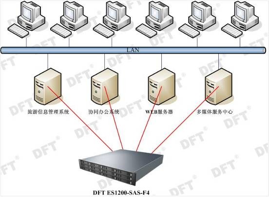 目前北京旅游局有四台服务器,分别运行不同的应用,存储数据的裸容量为6TB,为满足客户高带宽,高可靠性,高稳定性,高性价比的要求,DFT采用了DFT ES1200-SAS-F4这款产品,产品采用全新的FC-SAS架构设计,在同一个盘阵中可以实现SAS和SATA硬盘混装,并支持先进的RAID6功能,能更好的确保整个数据的安全性。4Gb FC的主机接口确保服务器的高性能,保证了持续的高速数据读写与传输,该存储产品可实现方便的扩容,充分考虑到旅游局日后的发展,为旅游局提供了完美的存储解决方案。
