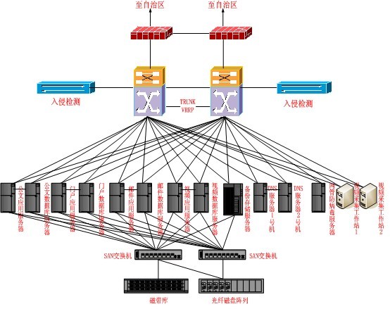 作为信息化建设的数据存储基础平台,如何保证数据的安全和高可用性就显得至关重要。这次内蒙古党建要求在网络中心部署1台全4Gb光纤存储阵列,通过两台光纤通道交换机构成核心的SAN存储环境。以存储设备为中心,支持数据存储服务功能。