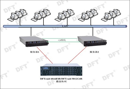 通过在两台服务器加装SCSI适配卡或FC适配卡与磁盘阵列连接,DFTraid 6016F4R/DFTraid 5012G4R磁盘阵列的RAID功能(支持RAID0,1,1E,5,6,10 and 50)将磁盘构建成1个RAID5+SPARE架构保障存储数据的安全。两台服务器之间通过两条心跳线(TCP/IP和RS232)互相监听对方服务器状态,由高可用的双机软件DFT HA来负责应用程序的切换,保障了应用程序不会因为意外宕机而造成服务中断。DFT-HA是一套提供有效防止主机意外宕机而造成服务中断的软件,当一台主机宕机或无法使用时,DFT-HA能及时侦测出故障并启动另一台主机中的相应程序而自动接管其服务。DFT-HA监控和管理每台服务器的资源,通过管理这些资源,DFT-HA能完成自动重启应用的功能。对于异常事件,DFT-HA可以及时处理,应用在关键业务环节和要求不停顿的商业环境。