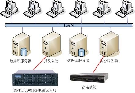 为满足用户需求,贵州公安厅指纹自动识别对比系统的方案在设计时,操作系统采用RedHat Linux Advance Server 2.1;数据库系统采用Oracle 9i ;存储系统采用性价比极高的DFTriad 5016G4R, 阵列系统使用高性能的64位PowerPC 750FX 600MHz CPU,极大的提高了产品的运算性能和传输性能。DFTraid 5016G4R充分考虑了用户在线存储的具体要求,为数据安全高速存储提供了可靠安全的保证,控制器采用独立硬件XOR(异或逻辑运算)芯片设计,不占用CPU资源,大大提升可靠性性能。系统采用16块146GB SCSI硬盘配置成Raid5+Spare.使存储系统更为安全可靠,备份软件采用Veritas NetBackup多平台自动备份管理软件,为数据的安全存储和备份工作带来极大可靠性。
