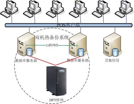DFT高可用双机系统由2台服务器,1台DFT磁盘阵列系统,1套DFT HA双机软件组成,双机热备工作方式为主从模式,两台机器共同使用一个虚拟IP地址提供应用服务,服务器(主机)正常运行数据库工作,备份服务器(从机)处于准备状态。系统通过DFT HA软件监控主机的应用进程,当主机出现任何软、硬件故障(如CPU、内存、网卡、阵列卡、所有硬盘、操作系统、应用程序等)导致应用进程停止服务时,从机自动接管主机的工作,而虚拟IP保持不变,客户端看不到服务器的故障即服务没有间断。
