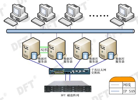 通过使用这种存储架构,再将两台数据库服务器配置成双机的架构,在平时两台服务器运行各自的业务应用,当一台服务器出现故障时,双机软件会自动用另一台服务器接管故障服务器;当两台服务器出现故障时,此时存放在磁盘阵列内的数据还存在,用户可以再使用一台新服务器接管所有业务应用。通过使用这种备份架构,可将4台数据库服务器的数据自动备份到DFT磁盘阵列内(在数据库使用的状态下),并根据用户的环境与需求定制备份策略,以保证数据的安全可靠。