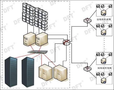 本方案采用两套DFT ES1600-SATA磁盘阵列,每台服务器上均安装FC光纤卡与光纤交换机相连。每一套磁盘阵列采用一台主柜和四台扩展柜的方式相连接,并采用 60块单块容量为500GB的SATA硬盘,创建RAID5,实时保证数据的安全性,同时也兼 顾了日后存储扩容的方便。这样,每套磁盘阵列的容量为28TB,共计56TB存储容量,以满足用户30天存储数据的需求。
