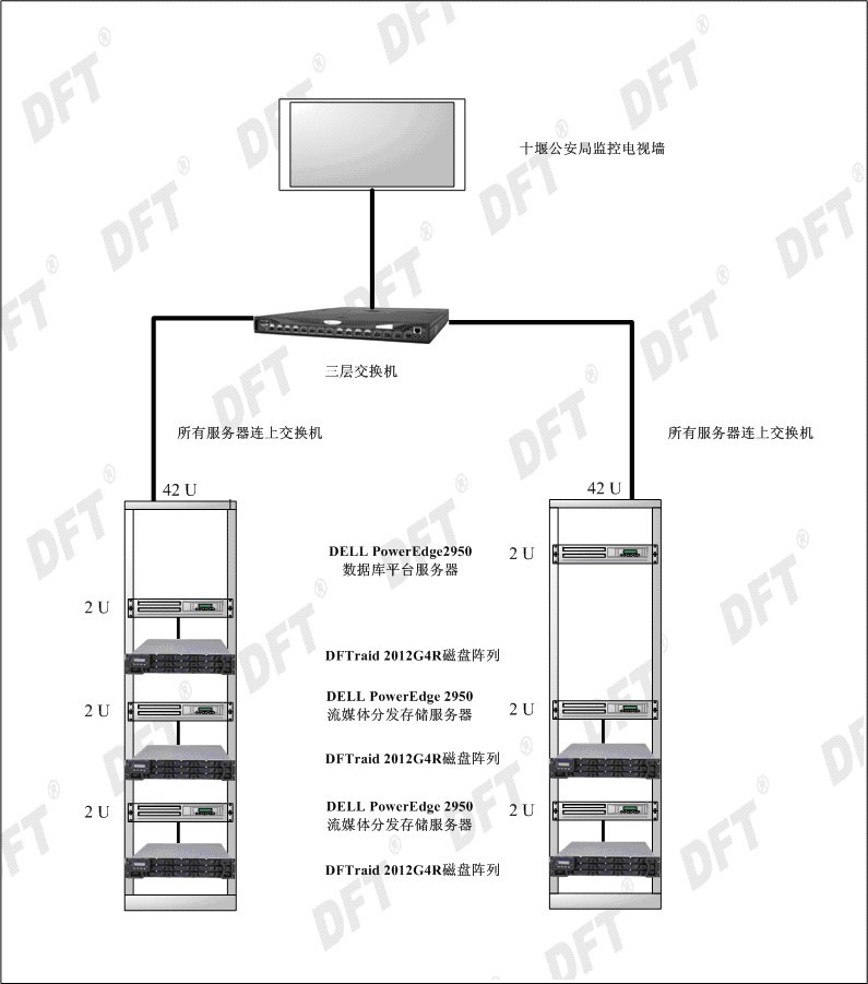 目前服务器主要是采用5台DELL PowerEdge2950流媒体服务器,操作系统采用WINDOWS 2003 SERVER,应用的流媒体服务软件为湖北维用提供的监控管理软件。此服务器将是整个流媒体存储的关键服务器,数据的安全,快速存储将直接影响到整个服务运行的稳定性。由于该项目是有中国电信湖北公司全额出资以租赁的方式给湖北省十堰市公安局使用,所以成本的控制以及性价比是用户中国电信方案设计的重点。该方案一期采用的是5台DFTraid 2012G4R磁盘阵列以DAS直连的方式分别接在5台流媒体服务器上。
