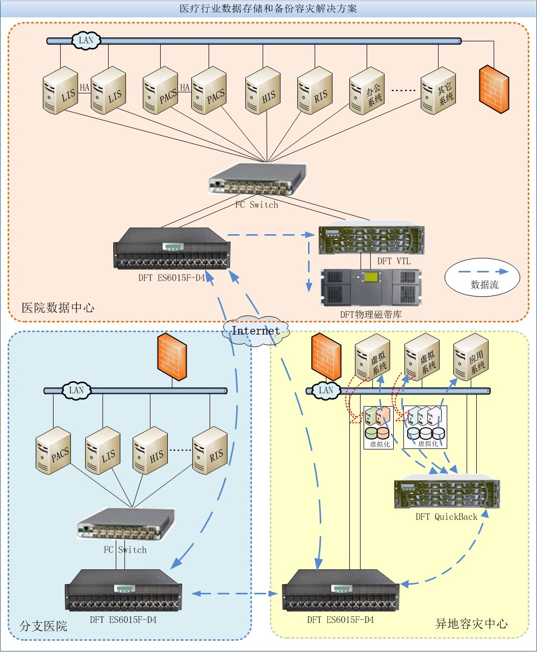 由于医疗行业数据的特殊性,要求存储系统的连续性以及数据保存的长期性,为了全面保证医院数据中心的安全,按照数据存储备份和容灾的不同需求和级别,我们建议采用多级的系统安全方案。根据对数据中心的应用分析,我们把整个应用系统划分多个级别――数据中心存储系统、数据备份系统、数据存档系统、数据容灾系统。通过多个安全级别的防护措施,充分保障服务器连续运行能力、数据的安全备份与容灾、发生故障时的及时恢复效率。DFT为医疗行业的数据平滑迁移、安全扩容、容灾备份提供一套完整的解决方案,整个存储应用系统可根据医院发展规划分步实现。在此方案中,建议采用DFT ES6015F-D4作为数据中心存储系统,结合DFT VTL和DFT物理磁带库实现数据备份和医疗病历信息存储归档,并且可根据需要随时建立数据容灾中心。