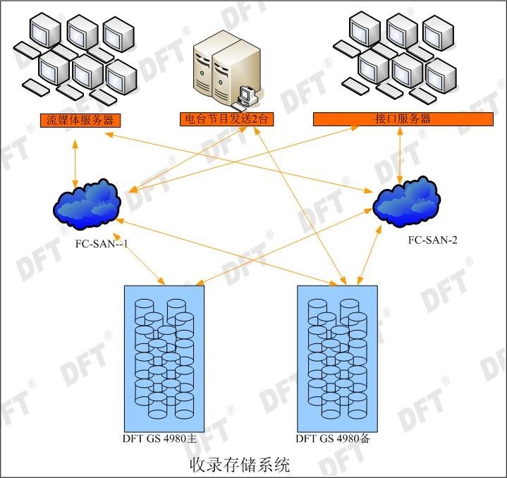 信息中心林主任表示:“在大楼建设初期,收录系统中的数据都存储在工作站中,安全问题存在很大隐患性,任何一台服务器宕机,系统都将面临数据全部丢失的风险。如何确保数据安全,成为新系统建设初期迫在眉睫需要解决的问题。根据客户的特别要求, DFT在其存储解决方案中,存储架构采用全冗余设计,通过主备交换机,将数据存储到DFT磁盘阵列中,保证了链路和数据的安全性。目前DFT存储产品可以满足收录系统的需求,并且在带宽上还略有余量。”同时该存储方案中又采用了DFT GS系列高端存储产品,提供了满足用户需求的存储带宽,保障了存储系统的稳定性,提高了存储系统高可用性。由于该产品还支持高达224TB的存储容量,为日后系统中增加节目提供了足够的存储空间,为整个收录系统的稳定运行提供了坚实的基础。