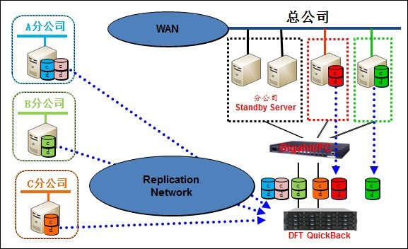 DFT QuickBack的远程复制是直接经由TCP/IP WAN传输数据,相比于传统容灾技术中的磁盘阵列复制经WAN专线传输(必须搭配一对非常昂贵的网关转WAN),使建设、管理与维护成本大幅降低。