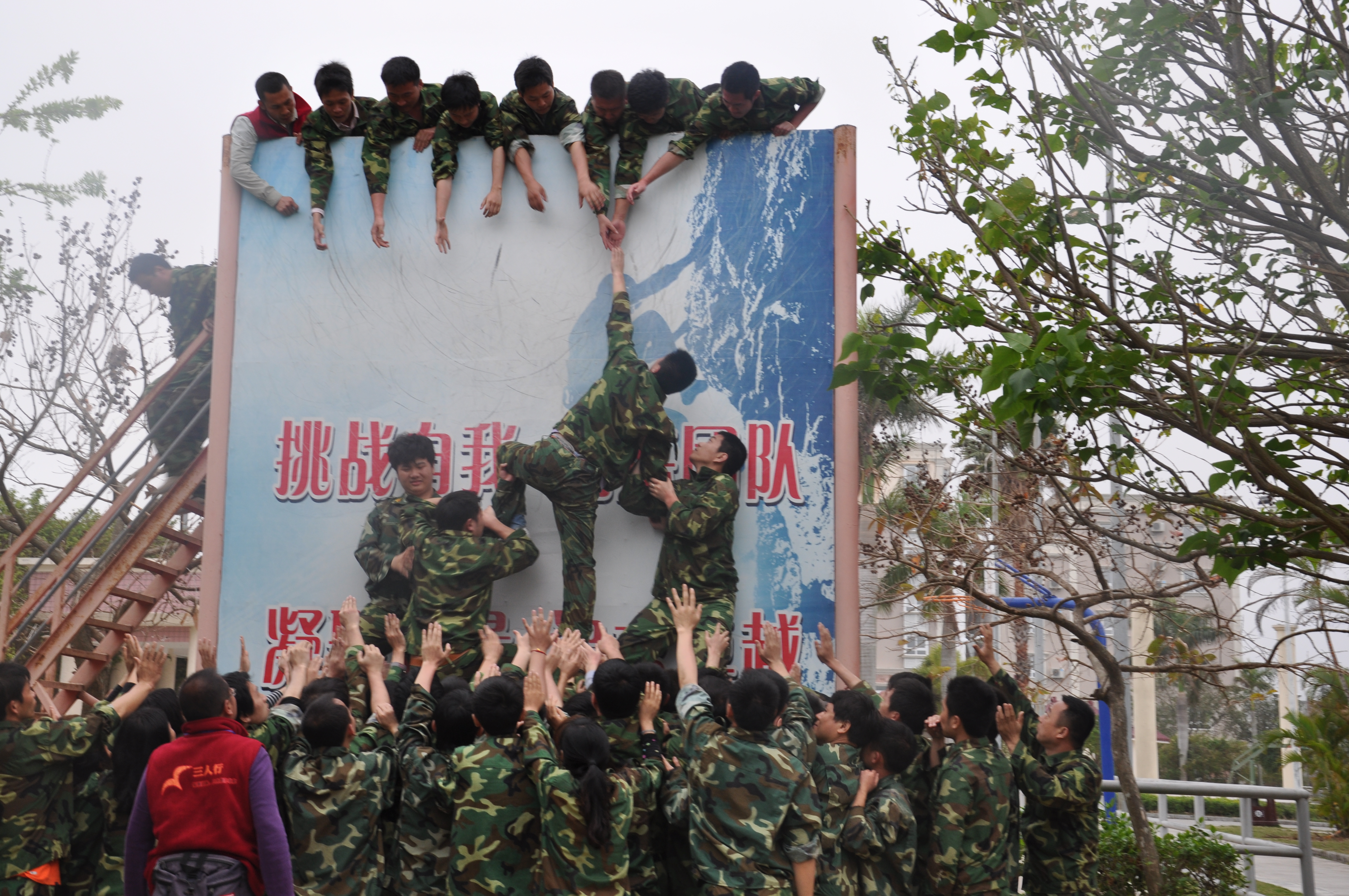 重点介绍一下最后一个项目,毕业墙。听到毕业墙可能第一反映就是毕业考试了,成绩合格才能予以毕业。此毕业墙是指团队在没有任何器材的情况下共同努力翻越4.5米高的墙壁,而教练给我们还有一个要求便是不能说话,必须安静的完成任务。此项目最重要的工具便是搭人梯,需借人梯的力量让下面的同事一个个攀爬上去。整个项目看到了所有人拼劲全力的帮助每一个人,看到了他们手拉手勇敢向上攀登时,我想没一个人选择放弃过,没有一个人后悔过。团队的力量就是这么强大,只要勇敢向前,就有成功的机会。DFT的所有战士都是最棒的!