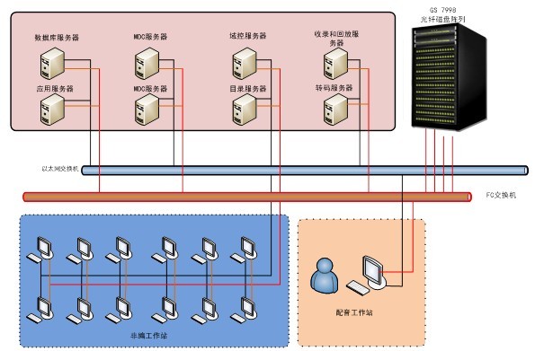 项目采用高效可靠的SAN+NAS系统结构,整体存储架构采用了双存储实时备份,确保了包括存储在内的整个网络无单点故障,极大的提高了网络化编辑的安全性。