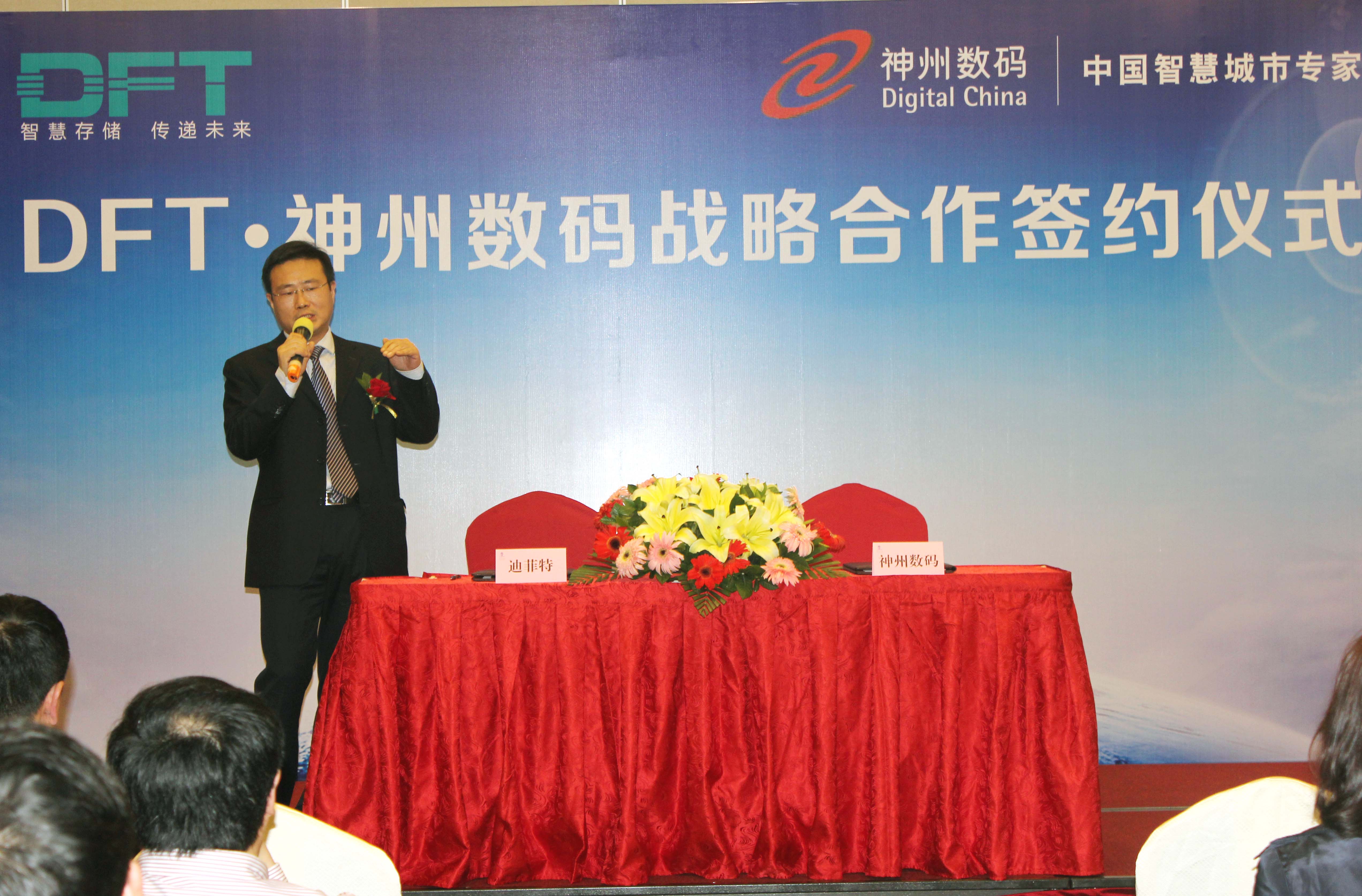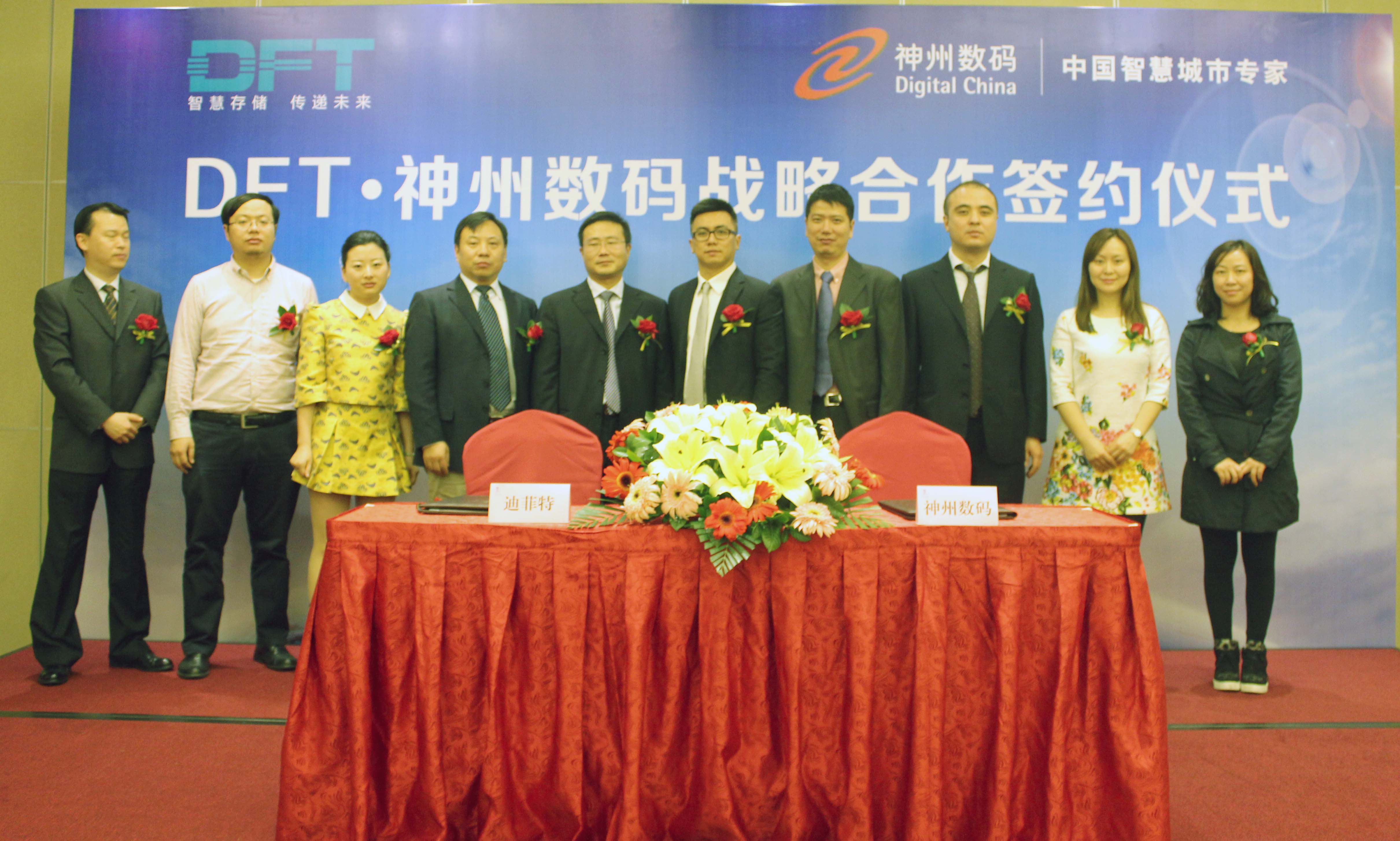 签约仪式上,神州数码第二安全本部本部长阎璐先生及DFT董事长刘卫东先生分别致辞,共同预示双方携手合作的美好未来。DFT董事长刘卫东先生在致辞中表示,神州数码作为中国最大的整合IT服务商,希望在国产化的趋势下,能够借助神州数码中低端市场优势打开DFT更宽度的市场覆盖;其次,希望通过二者网络资源的互补能够获得更多层面的配合;最后,相信在云计算大数据的发展趋势下,双方合作能够更快,更强,走的更远!签约仪式中,由DFT总经理李显斌先生与神州数码阎璐先生开始正式签订双方战略合作协议,代表双方合作正式启动,最后双方合作代表共同上台合影留念。